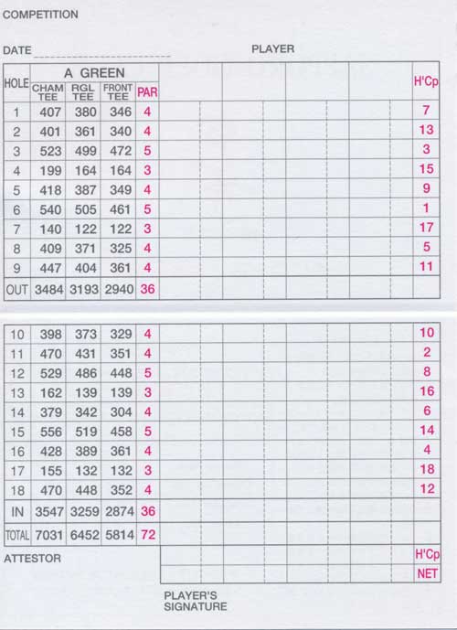 | コース概要: | 丘陵コース。アウトは丘陵地帯に造られたコースながら高低差はほとんど感じられない。全体を落葉樹でつつむ感じで展開する。フェアウェイは広い。ただし、微妙なアンジュレーションがあって2打からが難しい。インは雄大なコースでフェアウェイ両サイドの白樺松がきれい。グリーンは大きく、受けているが、うねりがかなりありパッティングには要注意。 | |